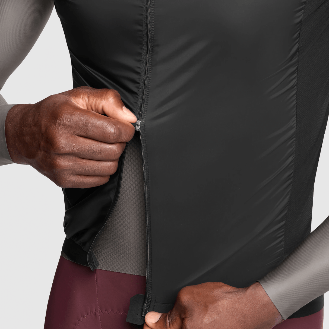 Sens Air na boki: Panele boczne z wysoce elastycznego materiału Sens Air dbają o to, by kamizelka idealnie przylegała do ciała, jednocześnie odprowadzając nadmiar ciepła tam, gdzie ochrona przed wiatrem nie jest krytyczna.