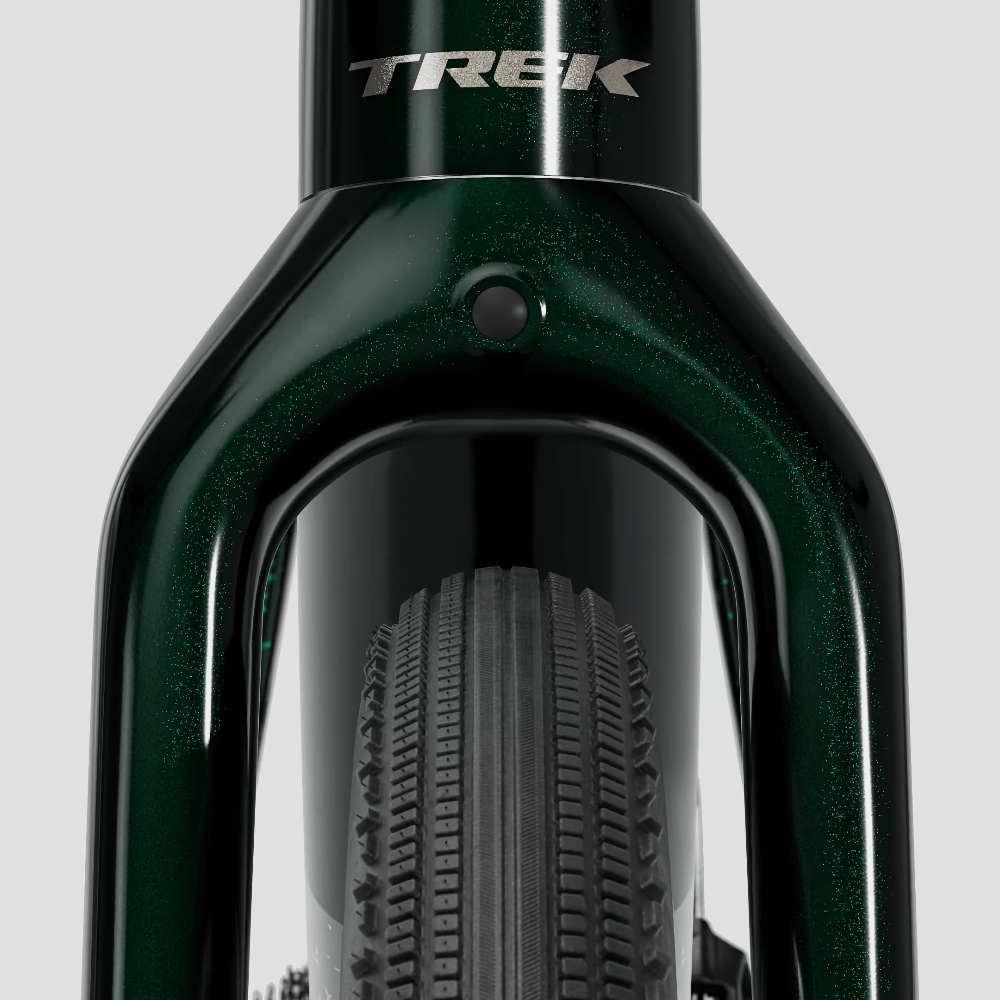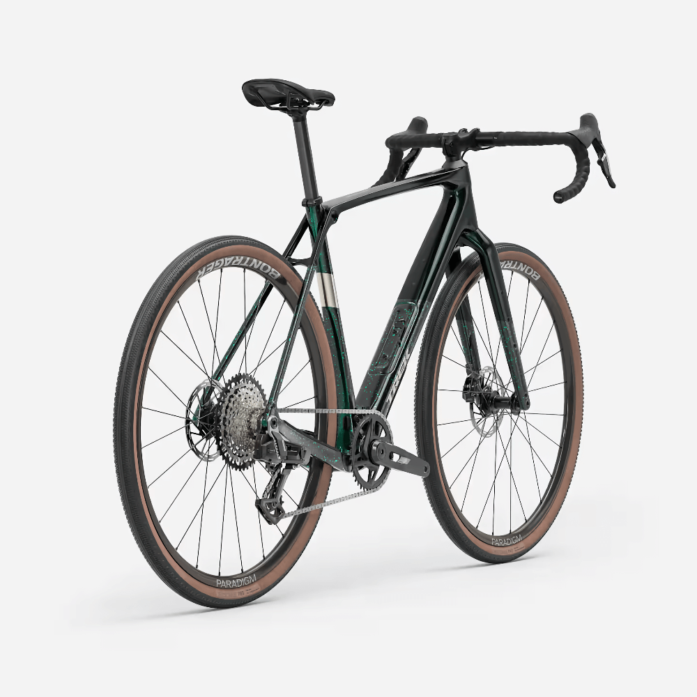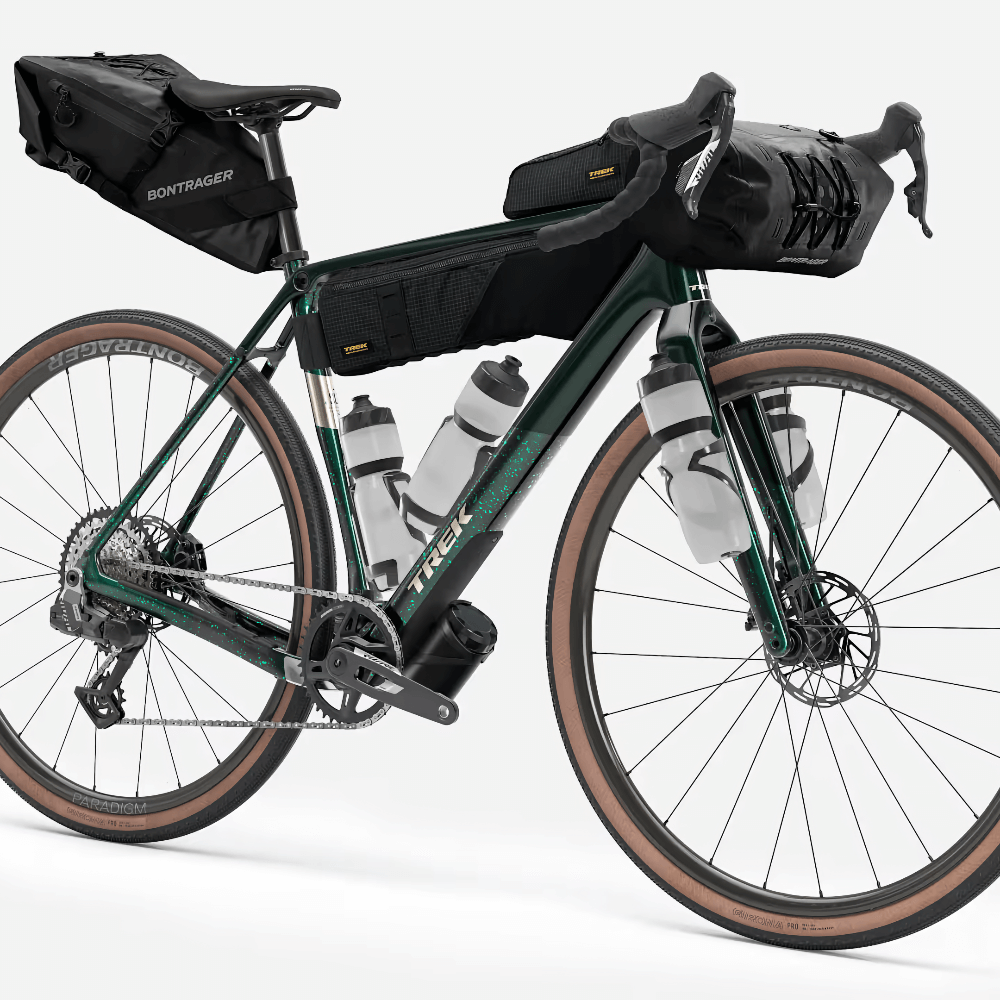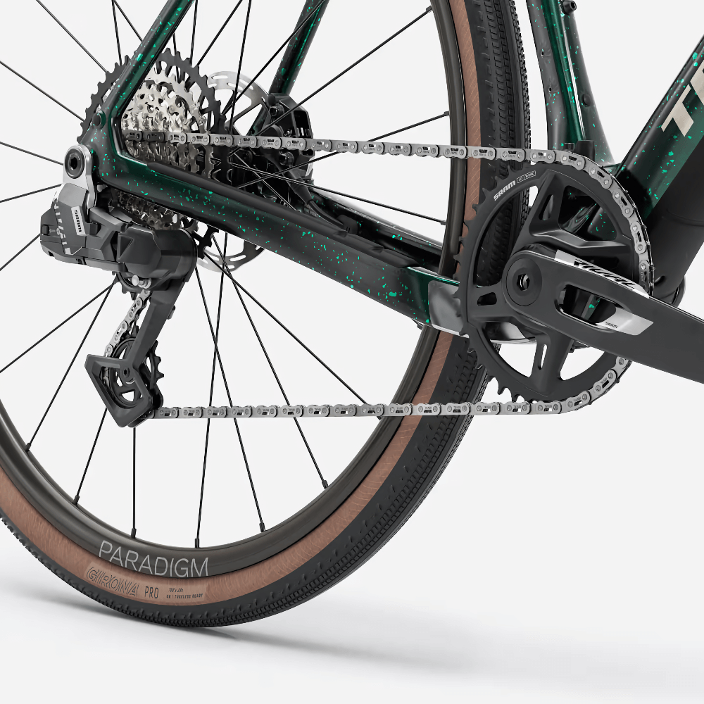 Bezprzewodowy napęd SRAM Rival XPLR AXS 1×12 z tarczą 40 T i kasetą 10-44 T działa błyskawicznie i bez kabli, a hydrauliczne hamulce Rival z tarczami Paceline 160 mm dostarczają pewnej siły hamowania w każdej sytuacji. Karbonowy widelec z potrójnymi mocowaniami cargo przyjmie koszyki lub bagaż, a koła Bontrager Paradigm Comp 25 TLR uzbrojone w opony Bontrager Girona RSL 42 mm są gotowe na jazdę bezdętkową i niższe ciśnienia. Całość waży około 9,4 kg (rozm. ML, setup TLR) i posiada limit systemowy 125 kg, dzięki czemu nie musisz rezygnować z ekwipunku na długiej trasie.