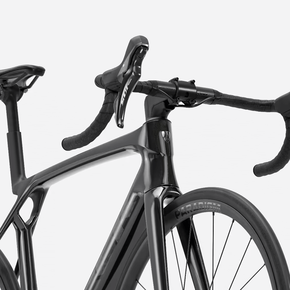Madone SL 5 bierze najnowsze rozwiązania z topowego Madone’a SLR Gen 8 i zamyka je w lżejszej, przystępniejszej ramie z włókna 500 Series OCLV Carbon. Nowe profile Full System Foil tną powietrze na każdym kącie, a technologia IsoFlow zmniejsza masę, poprawia zgodność pionową i jeszcze bardziej wygładza turbulencje za rurą podsiodłową. Całkowicie wewnętrzne prowadzenie przewodów nadaje sylwetce laboratoryjną czystość, a geometria Road Race H1.5 łączy agresję wyścigową z komfortem długiego dystansu. Mechaniczny napęd Shimano 105 R7100 2 × 12 to szybka, pewna zmiana biegów bez zależności od baterii, a koła Bontrager Paradigm SL Tubeless Ready utrzymują tempo i są gotowe na bezdętkę. Rower waży około 8,7 kg (rozm. ML) i mieści opony do 32 mm, więc nie musisz wybierać między szybkością a uniwersalnością.