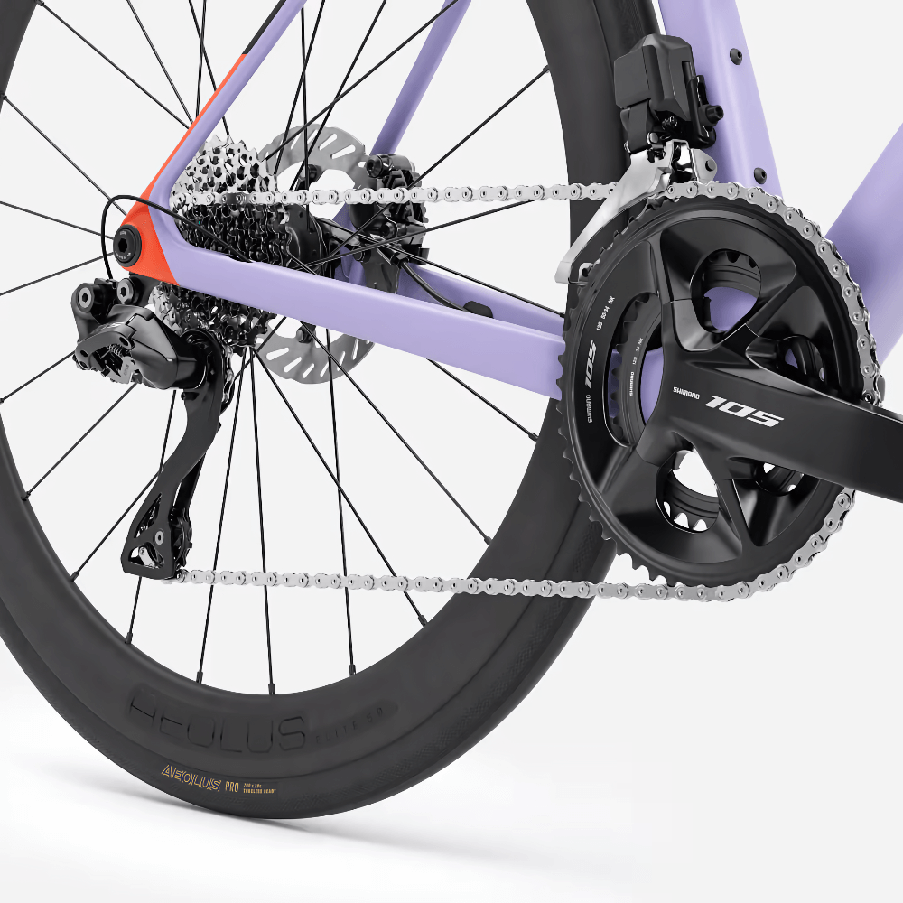 Madone SL 6 przenosi legendarne aero-DNA Madone’a do bardziej przystępnego pakietu. Rama z włókna 500 Series OCLV Carbon wykorzystuje profil Kammtail (VKF) i przełomowe rozwiązanie IsoFlow, które obniża masę, poprawia aerodynamikę i pochłania drgania z asfaltu. W pełni wewnętrzne prowadzenie przewodów nadaje sylwetce czysty, futurystyczny wygląd, a zaktualizowana geometria H1.5 balansuje agresję wyścigową z komfortem długiego dystansu. Napęd Shimano 105 Di2 2×12 oferuje bezprzewodową, błyskawiczną zmianę przełożeń, a koła Bontrager Aeolus Elite 50 Tubeless Ready utrzymują wysoką prędkość przy bocznym wietrze i dają możliwość szybkiego przejścia na bezdętkę. Całość waży około 8,5 kg (rozm. 56) i przyjmuje opony do 32 mm, więc nie musisz wybierać między szybkością a uniwersalnością.