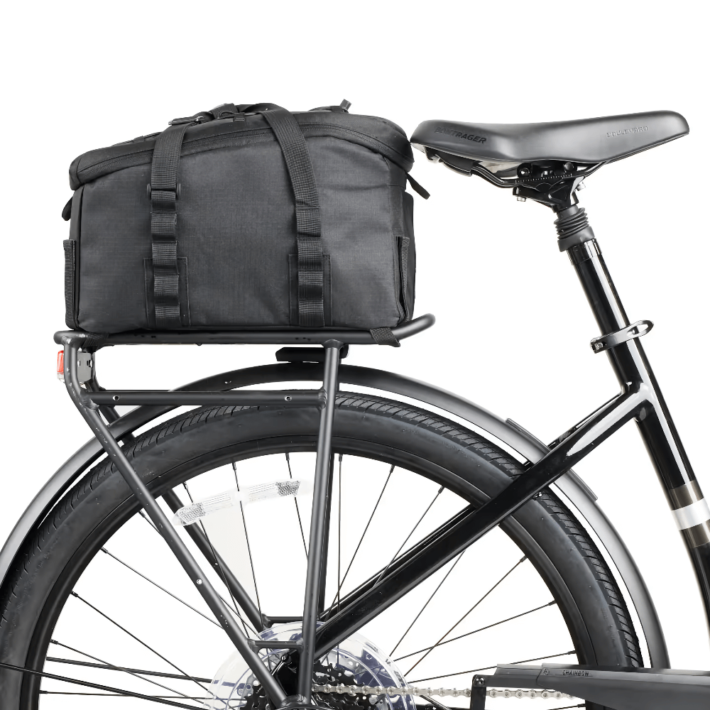 Torba na bagażnik Trek oferuje mnóstwo przestrzeni na ekwipunek i mocuje się ją do większości bagażników za pomocą pasków na rzepy, co wzbogaca rower o dodatkowe możliwości transportowe. Solidna konstrukcja z wytrzymałej tkaniny ripstop gwarantuje bezpieczne przewożenie zakupów, narzędzi czy innych przedmiotów w każdych warunkach pogodowych.